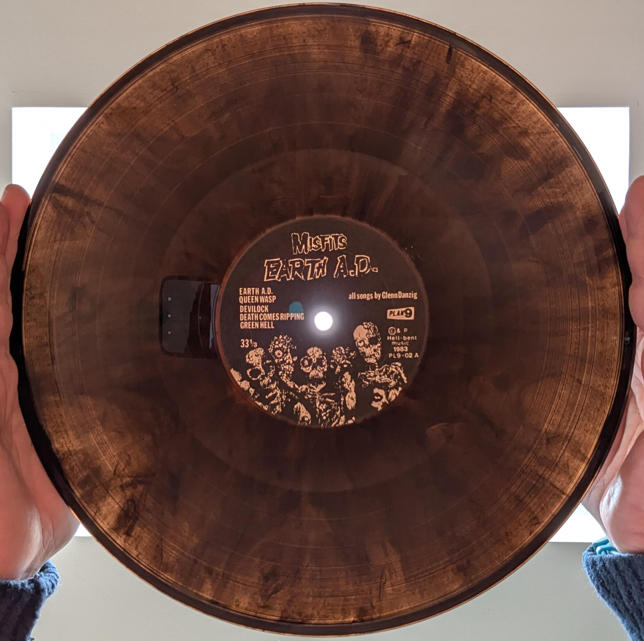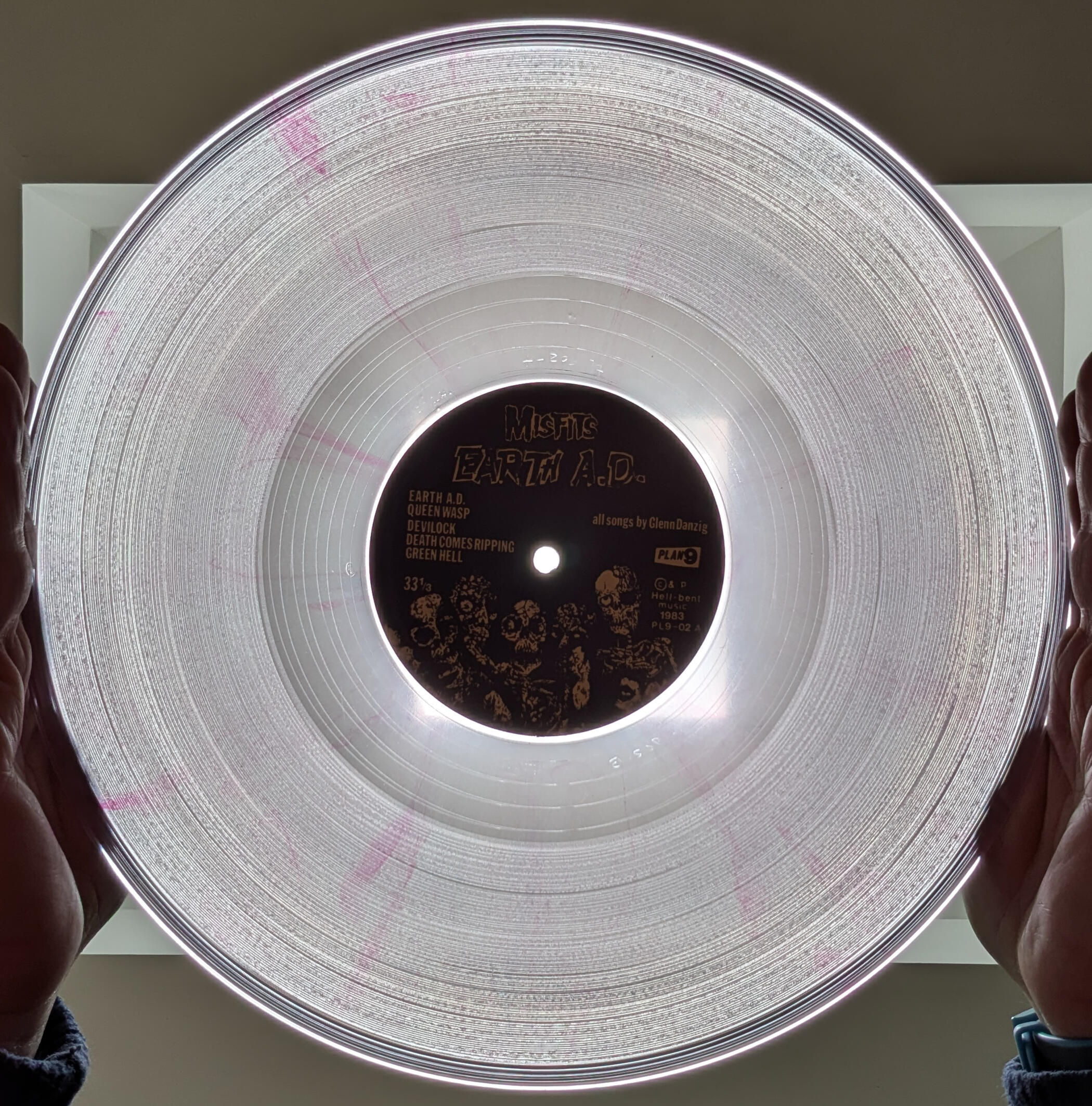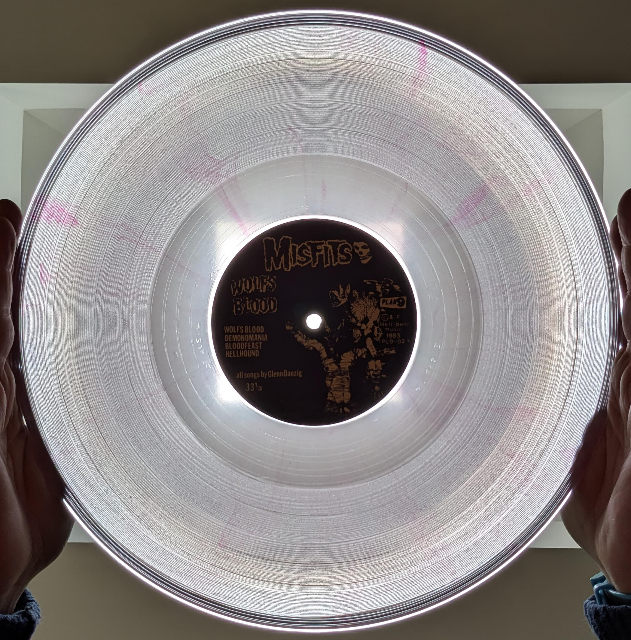 MISFITS Earth A.D. / Wolfs Blood LPA world class example of the ULTRA CLEAR variant, certainly among the most glass-like in existence. While the handful of red streaks lend a pinkish tint in regular room lighting, a pic beneath the skylight reveals what a crystalline beauty this one is!Jacket in Excellent (EX) condition. Vinyl in Mint Minus (M-) condition.Best offer over $8500. Offers accepted through Sunday, March 1st, noon CST.Email offers to [email protected] with ULTRA-CLEAR in the title or DM me on Instagram.
